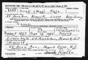 AKA: Isidore, Issak Born: 12 Jun 1886 - Palshitsow, Poland 38 Christened: Died: 22 Jan 1957 - Newark, Essex, New Jersey, USA Buried:Spouse: Esther Kalb [66] (Abt 1891-1968) Marr: 1913 - Newark, Essex, New Jersey, USA [MRIN:12]